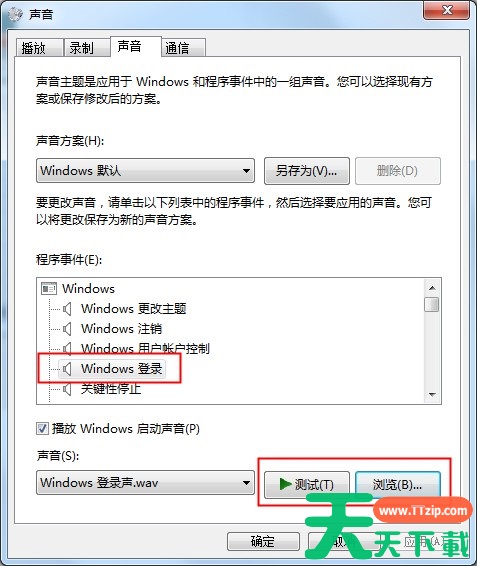 4、我们看到默认方案时下方的“播放”和“预览”都是灰色状态,那么我们从程序事件选项下找到“windows登录”选项,这时下方的播放和预览状态变成了实体,我们点击浏览然后并找到存放音乐的路径选择即可,这时可以看到登录声音已经变成了我们设置的音乐,点击应用后即可生效。