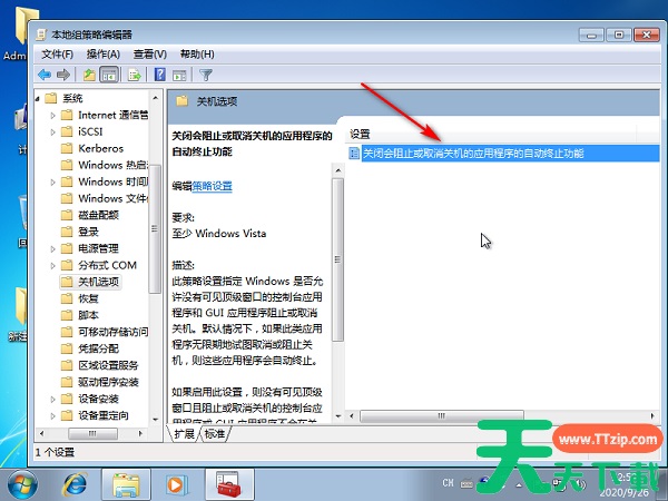 3、之后在右侧的双击打开关闭会阻止或取消关机的应用程序的自动终止功能,勾选已启用,最后点击确定即可。