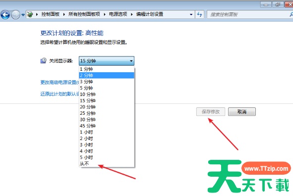 5、返回上个页面,选择“”选择关闭显示器的时间”按钮,也将选项调至为从不选项,并点击保存修改即可。