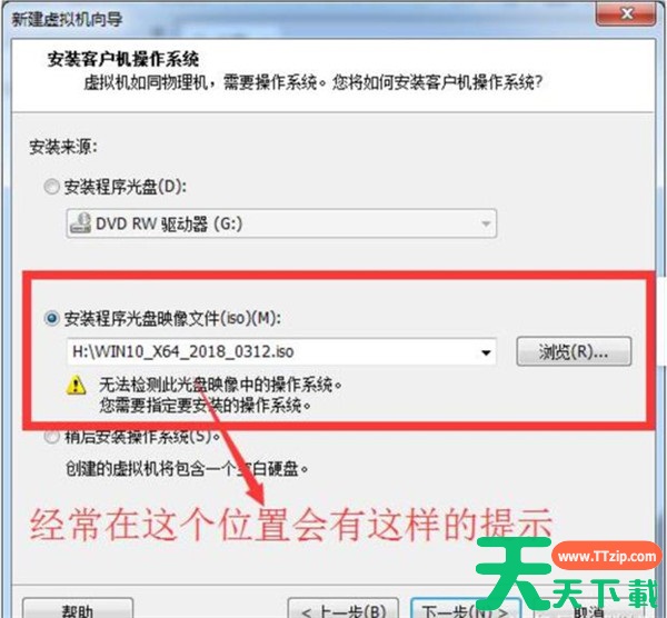 这里是选择安装创建的虚拟机的操作系统,有的ISO镜像文件在安装程序光盘选项中会报错,提示“无法检测此光盘映像中的操作系统。”所以,在这里一般都是选择“稍后安装操作系统”。