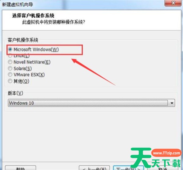 4、现在是选择你所要安装的客户机操作系统,因为我这里要装的是win10所以选择的是Microsoft Windows(W)。