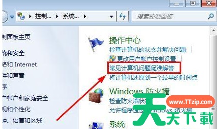 2、点击“系统和安全”选择“操作中心”下方的“常见计算机问题疑难解答”;