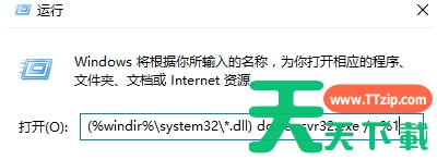 3、在运行对话框输入 for %1 in (%windir%\system32\*.dll) do regsvr32.exe /s %1 命令,点击确定进行运行。