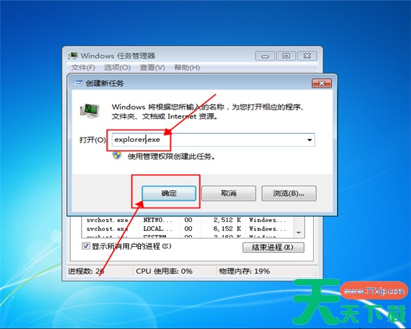 5、在【创建新任务】栏里重新把【explorer.exe】输入【确定】即可。