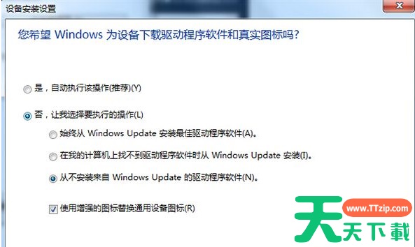 4、将“是,自动执行该操作”改为“否,让我选择要的操作”,然后选择“从不安装来自Windows updata的驱动程序软件”,再确定。