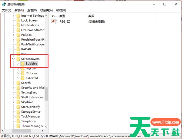 2、打开编辑器之后定位到:HKEY_CURRENT_USER\Software\Microsoft\Windows\CurrentVersion\Screensavers\Bubbles;