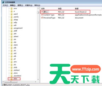 7、按照同样的方法,我们进入注册表寻找“xlsx”的位置,并将(默认)改为Excel.Sheet.12;然后寻找“pptx”,将(默认)改为PowerPoint.Show.12;