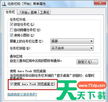 如果电脑中的Win7版本是包含Aero特效的,那也有可能是没有开启该功能。用鼠标右键点击开始按钮,选择属性,在“任务栏和开始菜单属性”中切换到 “任务栏”选项卡,查看最下方的“使用Aero Peek预览桌面”是否被勾选,如果没有,则将该项选中,然后点击“确定”按钮保存设置。