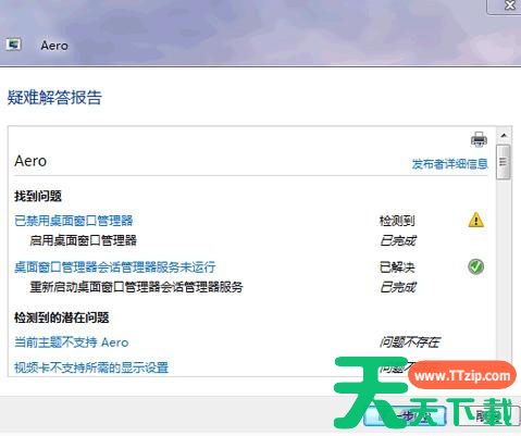 问题解决后,Aero效果就能够正常显示了。如果问题没有解决,或者你想查看详细的诊断报告,可以点击查看详细信息。