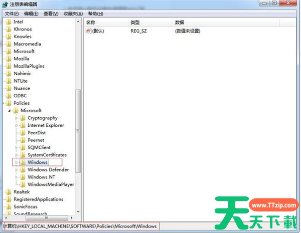 2、打开注册表编辑器后,依照顺序展开“HKEY_LOCAL_MACHINE\SOFTWARE\Policies\Microsoft\Windows”。