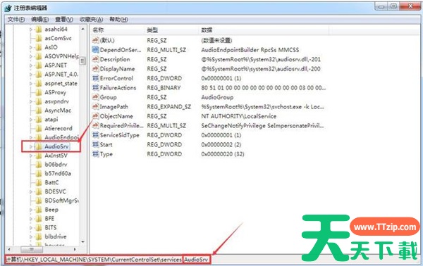 2、打开注册表编辑器后,依照顺序展开HKEY_LOCAL_MACHINE/SYSTEM/CurrentControlSet/Services/Audiosrv.。