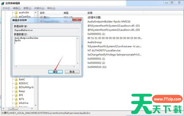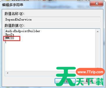 3、展开到Audiosry后,点击在右侧找到DependOnService项,接着双击打开,在数值数据栏中,将系统默认的MMCSS项删除。
