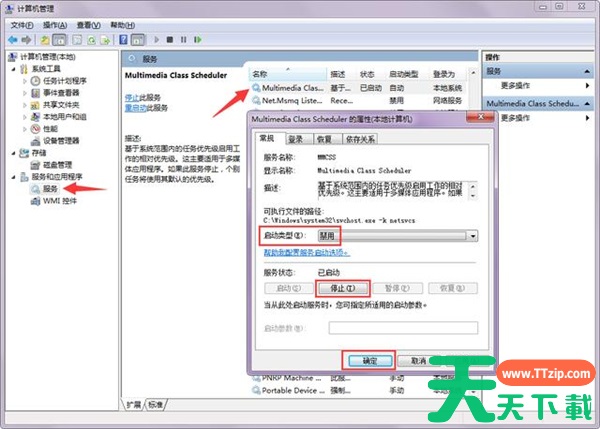 4、删除完成后,回到电脑桌面,点击计算机(我的电脑),然后选择管理,在计算机管理界面中进入到服务窗口,找到Multimedia Class Scheduler并将它停止,然后将启动类型设置为禁用即可。