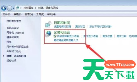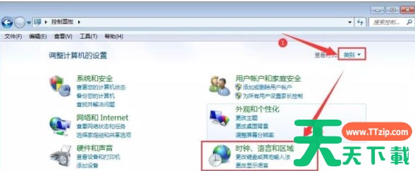 2、在【控制面板】中找到【查看方式】选择【类别】,并找到点击【时钟、语言和区域】;