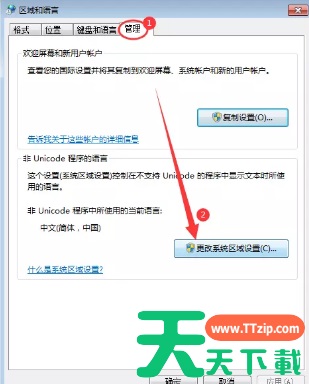 4、在弹出的窗口上方选择【管理】,然后点击下方【更改系统区域设置】;