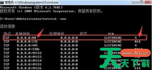 5、按回车键后,会显示当前电脑中程序占用的端口和程序ID等等信息;看到第一条就是:0.0.0.0:80 这是80端口,是tcp协议的,后面PID是4;