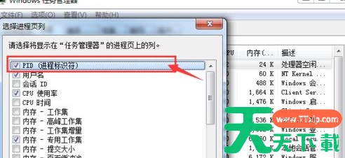 7、如果是没有看到PID,就需要设置一下管理器:“查看”->“选择列”->勾选”PID”选项;
