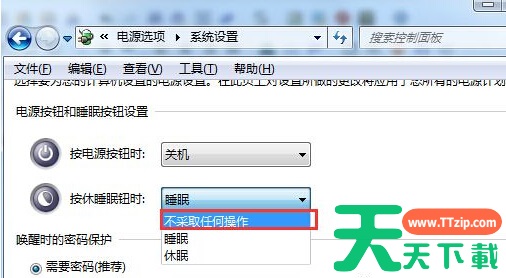 4、 如果笔记本电脑上是有带休眠快捷键的,那么可以在这个设置界面看到有个“按休睡眠钮时”选项,点击修改设置为“按休睡眠钮时:不采取任何操作”,最后确定就可以了。
