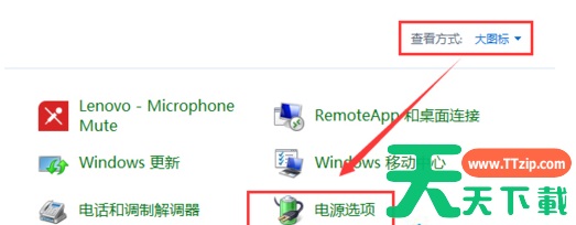 1、首先点击桌面左下角的开始按钮,选择控制面板。然后将控制面板的查看方式改为大图标,找到电源选项,点击打开;