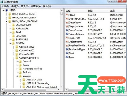2、在注册表左侧依次展开:HKEY_LOCAL_MACHINE\\SYSTEM\\CurrentControlSet\\Services\\lanmanserver ;