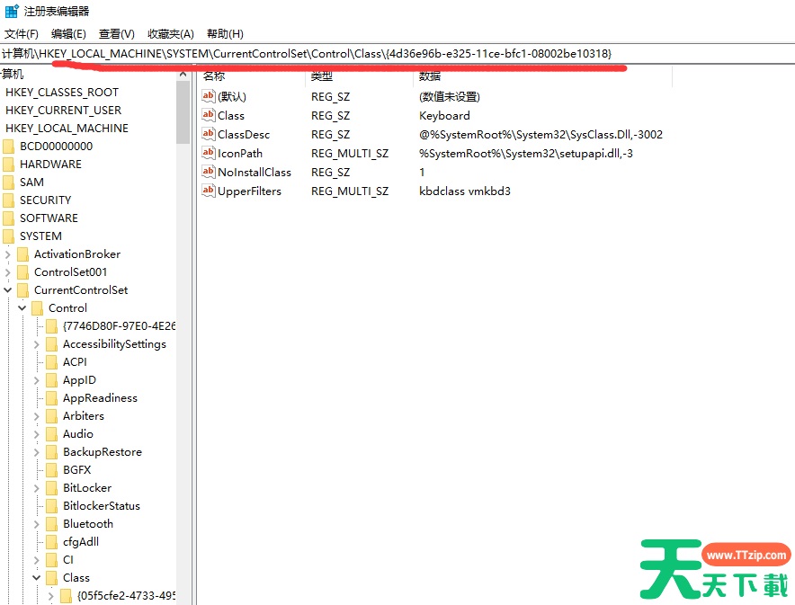 4、在注册表编辑器中找到对应路径“Hkey_LOCAL_MACHINE/SYSTEM/CurrentControlSet/Control/Class{4D36E967-E325-11ce-BFC1-08002BE10318}”。
