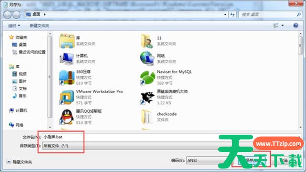 3、最后我们弹出的另存为窗口中,随意修改一个文件名字,在文件名后缀名加上“.bat”。保存类型选择为所有文件,点击确定即可。