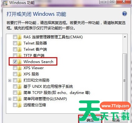 4、在打开的Windows功能窗口,勾选“Windows Serach”选项,点击确定完成设置。