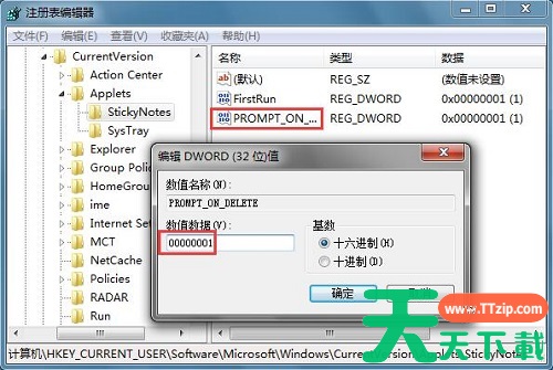 3、 双击 PROMPT_ON_DELETE 注册表项,在“值”数据框中,键入 00000001,然后单击“确定”。