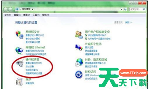 2、在“控制面板”界面中,选择“硬件与声音”;