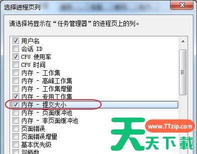 3、在【选择进程页列】对话框中勾选【内存-提交大小】选项,如图所示;