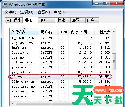 4、至此,我们已经可以看到程序所占用的虚拟内存,比如QQ.EXE这个程序所占用的物理内存为34M,虚拟内存为103M。