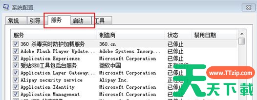 2、在打开的系统配置窗口中,切换到“服务”和“启动”标签页,把其中的不必要的启动项和服务全部打勾,然后点击右下角的“全部禁用”,确认之后,重新启动Win7 64位旗舰版系统就可以了。