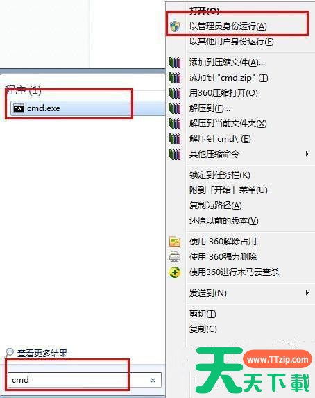 2、接着点击开始按钮打开开始菜单,并在搜索框中输入cmd命令,然后右击选择“以管理员身份运行”;