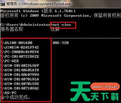 2、打开管理员命令界面后,在光标闪动处输入“net view”,回车确认即可看到局域网中所有正在运行的电脑,如下图所示:
