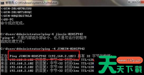3、接着继续输入“ping ―4 计算机名称”,比如要找的是“JINXIN―02A5F942”的IP,然后按回车键确认即可查看到这台电脑的IP地址了,如下图所示: