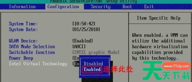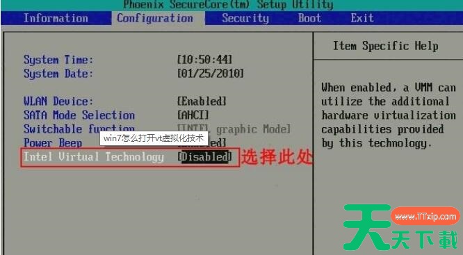 1、首先键入BIOS模式。切换到“Configuration”选项,将光标移动到“Intel Virtual Technology”并按下回车,如果没有找到VT选项或不可更改,说明不支持VT技术。