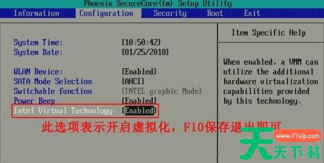 3、回车完成后此时该选项将变为Enabled,按F10键保存并退出即可开启VT功能。