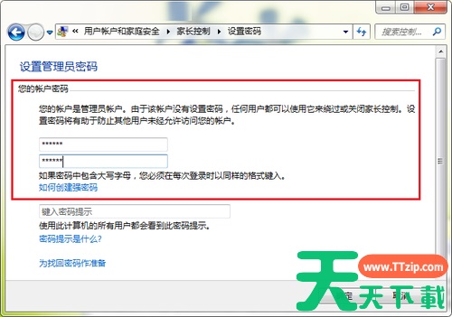 要使用Win7系统内置的家长控制功能,首先管理员账户必须设置密码,否则任何用户都可以跳过和关闭家长控制功能。以计算机管理员身份登录系统,打开 “控制面板”,单击“用户账户和家庭安全”下的“为所有用户设置家长控制”,进入“家长控制”窗口,单击“计算机管理员”帐户,进入“设置密码”窗口,设置好管理员密码。