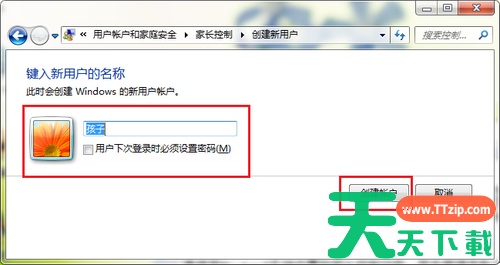 在Windows7系统中,要使用家长控制功能限制孩子使用电脑,还得为孩子专门创建一个帐户,在“家长控制”窗口中,单击“创建新用户帐户”,进入“创建新用户”窗口,输出用户名(如:孩子),单击“创建账户”,并设置好登录密码,创建一个名为“孩子”的新帐户。