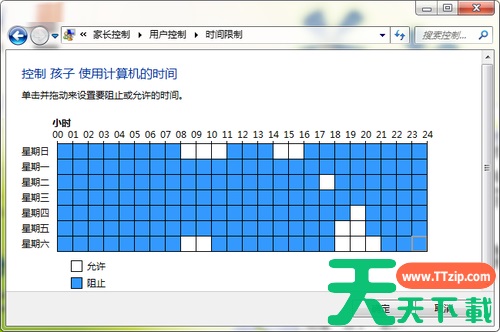 2、限制使用时间。在“用户控制”窗口中,单击“时间限制”,进入“时间限制”窗口,在方格中单击鼠标左键,或者按住鼠标左键拖动,设置阻止或允许用电脑的时间,最后单击“确定”按钮,保存设置(如图4),这样孩子就只能在设置为“允许”的时间段使用电脑了。