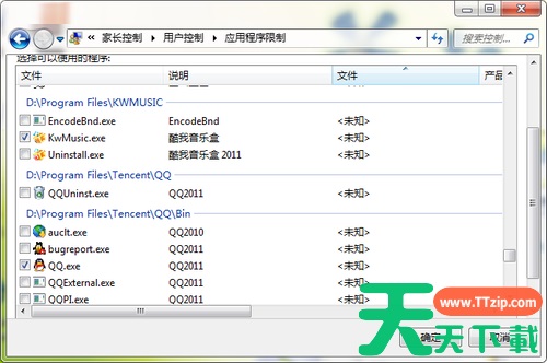 4、限制特定程序。在“用户控制”窗口中,单击“允许和阻止特定程序”,进入“应用程序限制”窗口,选择“孩子只能使用允许的程序”,然后在“选择可以使用的程序”列表中勾选允许孩子使用的程序,最后单击“确定”按钮,保存设置,这样孩子在使用电脑时只能运行允许孩子使用的程序。