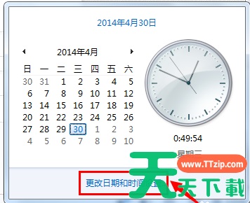 接下来点击任务栏中的“时间”图标,从打开的界面中点击“更改日期和时间设置”按钮。