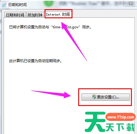 切换至“Internet时间”选项卡,点击“更改设置”按钮。