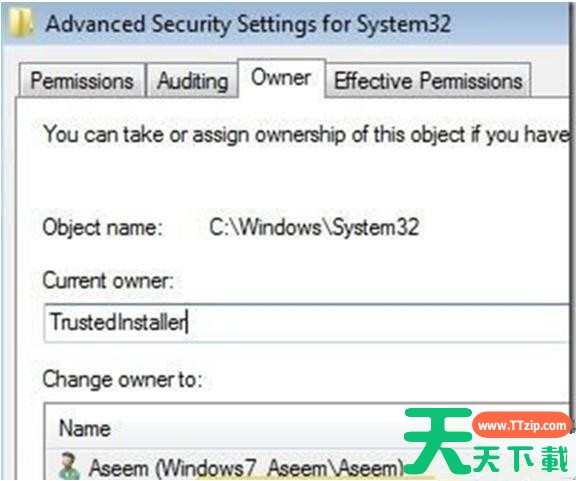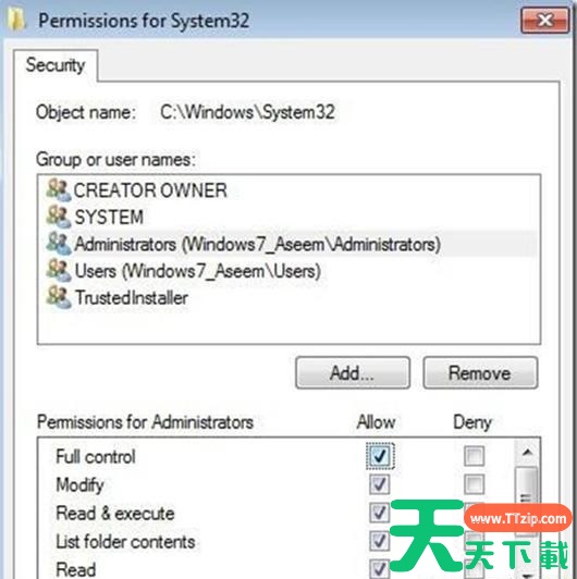 在清理一些电脑文件的时候,会发现有些系统文件是以“信任安装”的,即使使用管理员帐户登录Windows7旗舰版系统进行删除操作,也会弹出“没有执行的权限”或是“你需要信任安装授权来执行”的提示。这里天天下载Ttzip就给大家讲讲怎么删除“信任安装”文件的操作步骤。