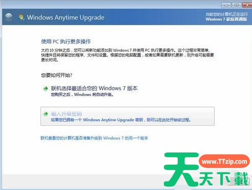 3、单击Windows Anytime Upgrade,弹出界面,选择“输入升级密钥”;