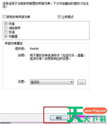 设置均衡器,调整音效,那么点击”均衡器“选项,然后在下面的”设置“下拉框中选择喜欢的音响效果,感觉现场、流行音乐、摇滚乐几种效果都可以。