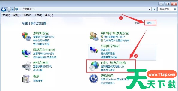 2、打开控制面板,设置【查看方式】为类别,找到并点击【时钟、语言和区域】,