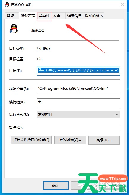 1、首先我们以常用的软件QQ为例,我们右键点击QQ,在弹出的列表中我们选择“属性”。