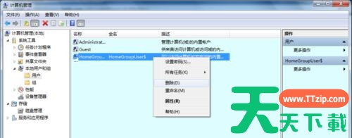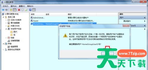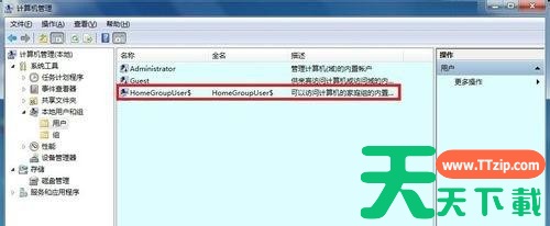 5、再去计算机管理→本地账户和组→用户→是否多出来一个账户名称后面带$的隐藏的账户(HomeGroupUser$);