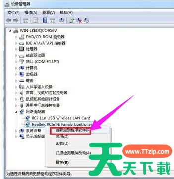 在有问号(感叹号)的程序上面单击右键选择“更新驱动程序软件”,一步步重新安装网卡驱动程序,或者用驱动软件也能自动安装驱动程序,安装好后,“本地连接”就会出现的。